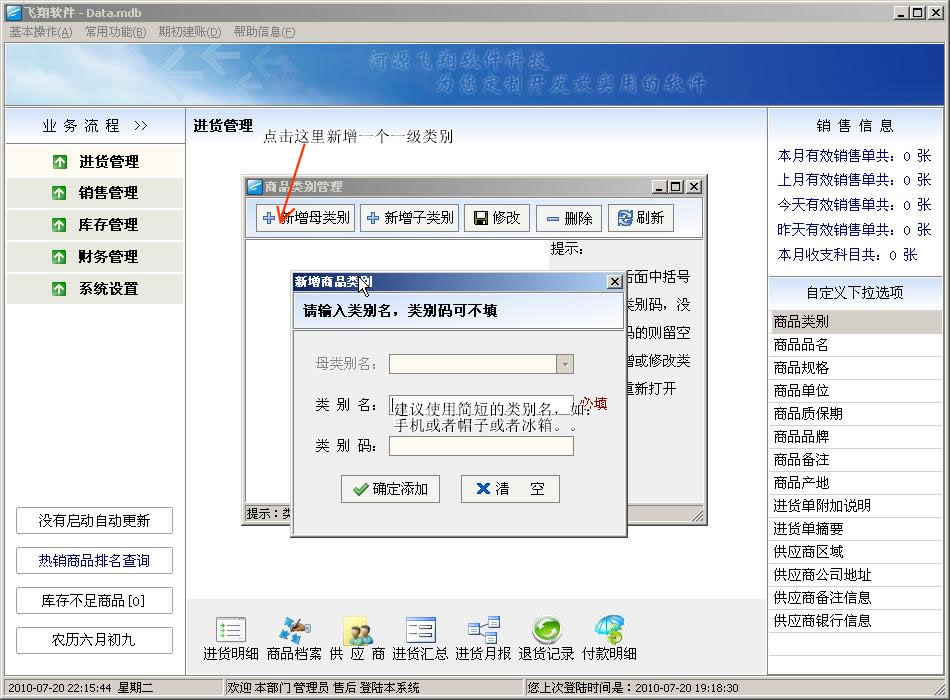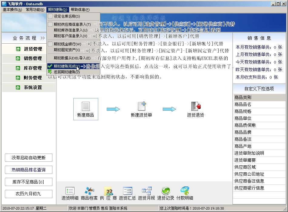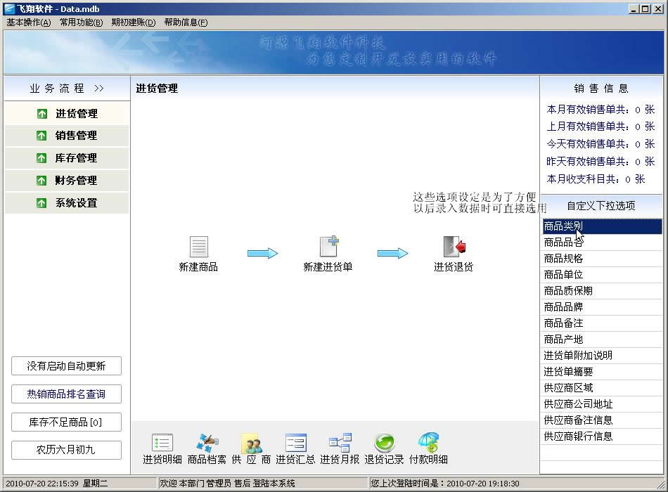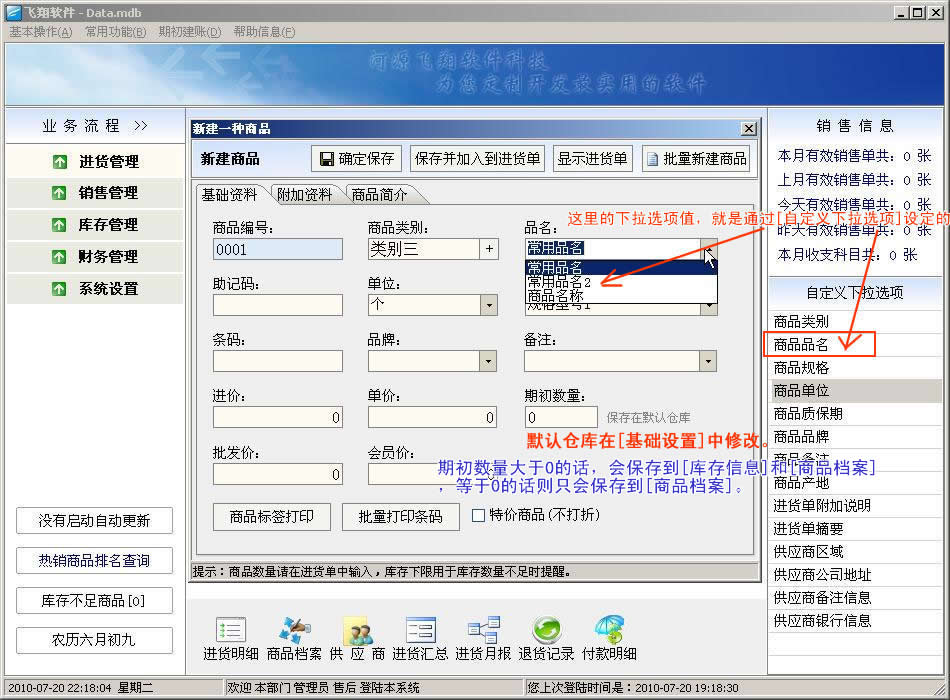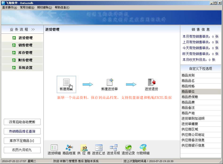 飞翔进销存软件新手图文教程:第一步,打开软件后,会看到以下界面,请参考文字说明: