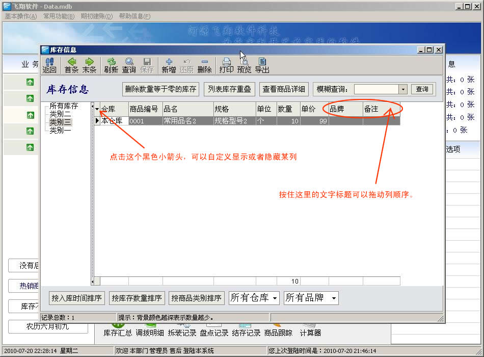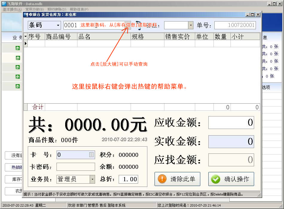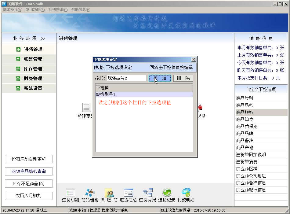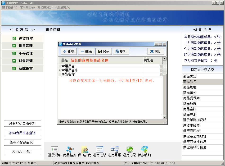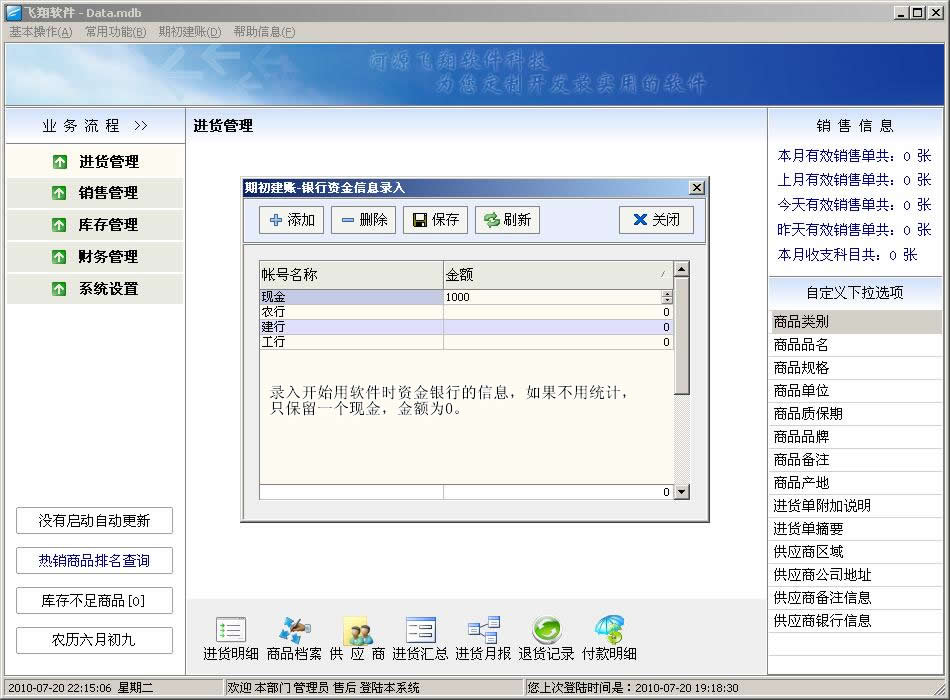 飞翔进销存软件新手图文教程:第一步,打开软件后,会看到以下界面,请参考文字说明: