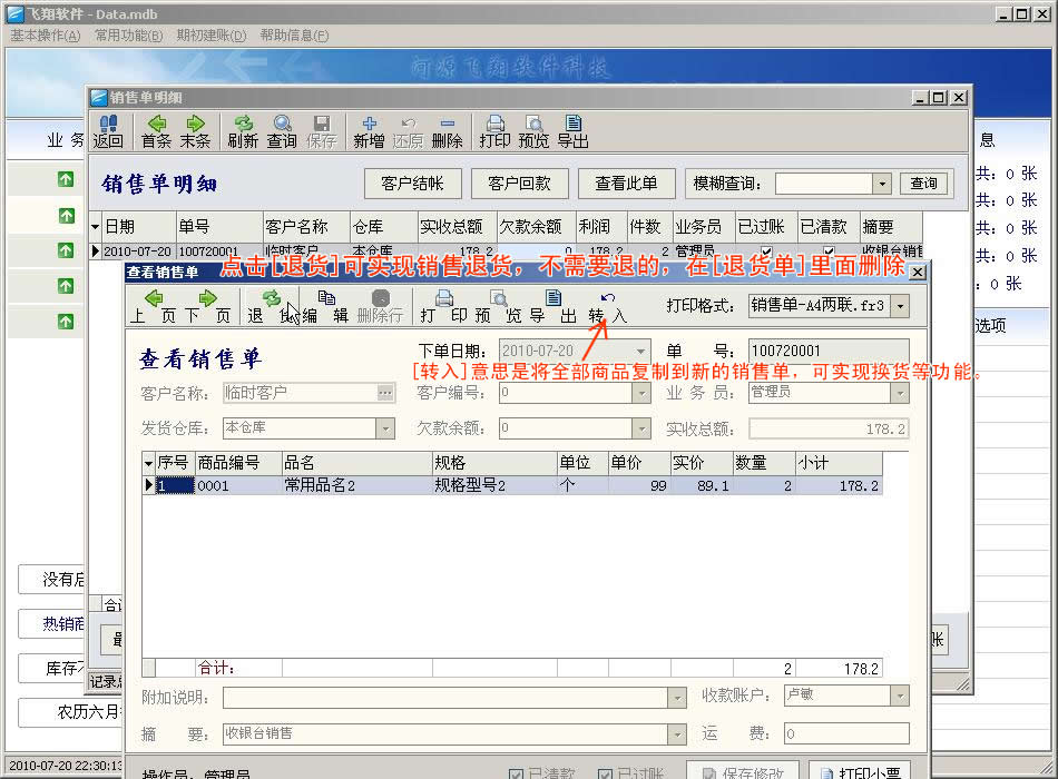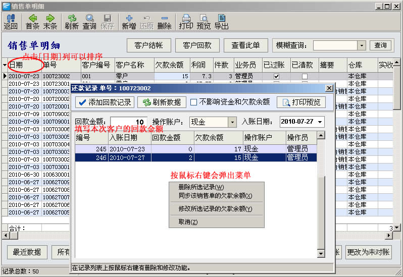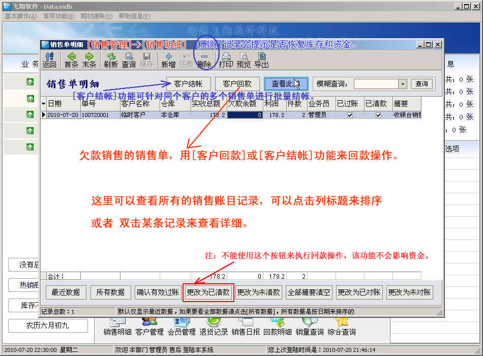 [销售明细]的功能说明,[客户结帐]是针对该客户的多条销售记录来批量处理,[客户回款]则只是针对一条记录,来处理。