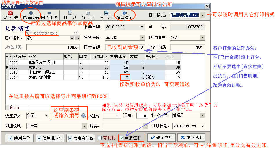欠款销售:意思是客户挂账、赊账所开的销售单,保存后,也是在[销售管理]->[销售明细]里面可看到。