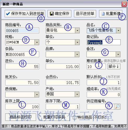 | A: 软件自动生成的商品编号,根据【基础设置】里面的商品编号位数和基数生成。 B: 商品类别可以在进货管理的右侧【自定义下拉选项】中找到,设定好后,这里会出现下拉菜单。 C: 品名即商品的名称,如:笔记本电脑 D: 可以把规格看成型号或重量。 E: 输入品名的时候会自动生成拼音助记码。 F: 商品条码,可以用扫描枪直接在这里刷,默认软件根据商品类别和商品编号自动生成条码。 G: 备注可以填写商品尺码或者颜色,因为它可以自定义下拉菜单,方便选择。 H: 商品进货价,输入后软件会根据【基础设置】里面的单价公式自动生成单价等。 I: 期初数量即软件开始时的库存数量(不打算录入进货单的商品),大于零的话会保存到【库存信息】里面。 J: 默认折扣意思是商品的折扣值,销售时会自动读取计算折扣生成价格。 K: 商品提成率用于计算业务员的提成,在销量查询里面按业务员查询即可看到。 L: 库存上限即库存数量过多时会自动提醒。 M: 库存下限即库存数量低于这个值时会在软件左下角提醒。 N: 该商品的默认供应商,点击放大镜可选择一个供应商,可根据此编号列出某供应商的商品或查询该供应商销量。 O: 保存商品资料,而且添加一份资料到进货单。 P: 批量新建商品,支持从EXCEL表格粘贴数据。 |